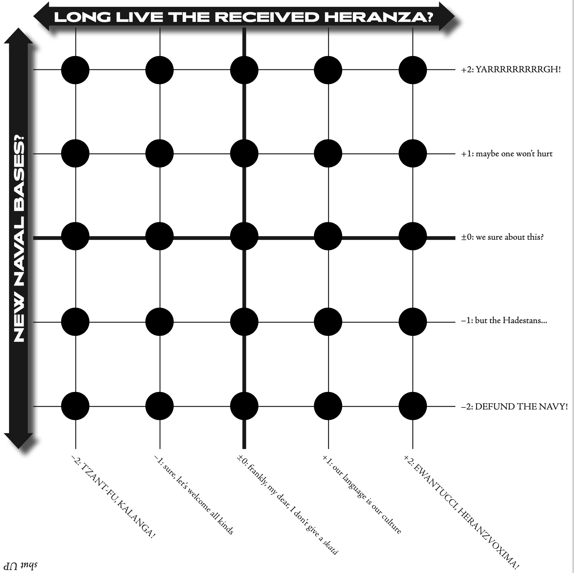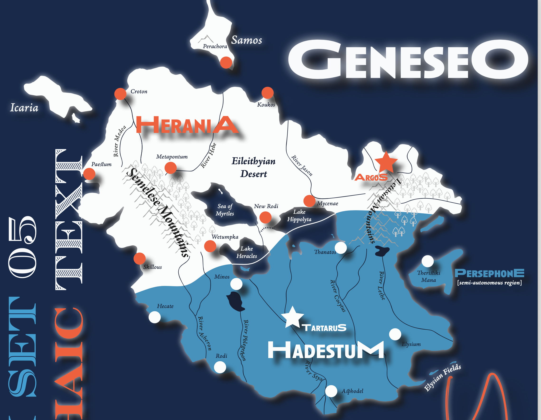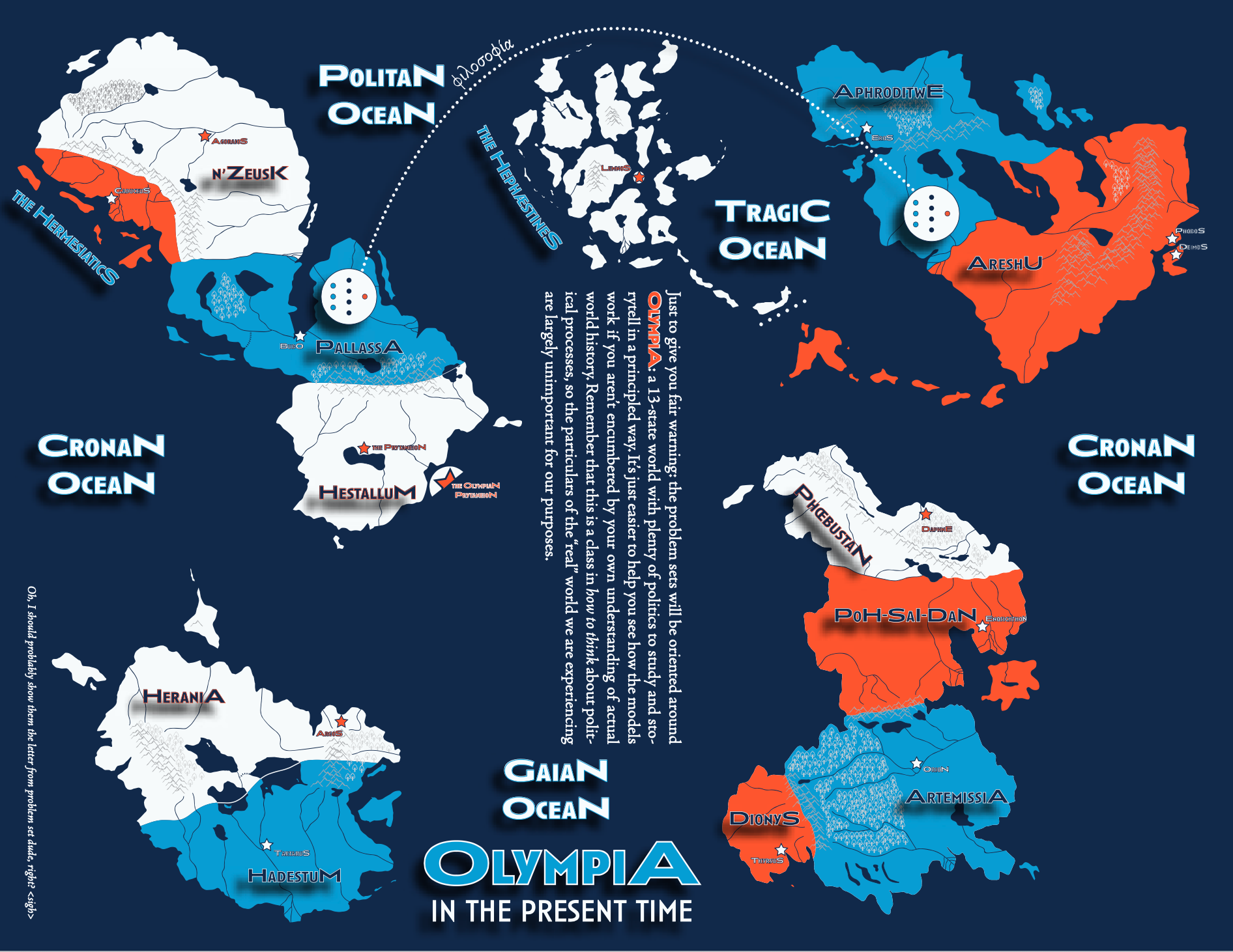 I think my favorite is Problem Set 05, which features two political parties in the country of Herania (named for Hera, of course) on the continent of Geneseo.