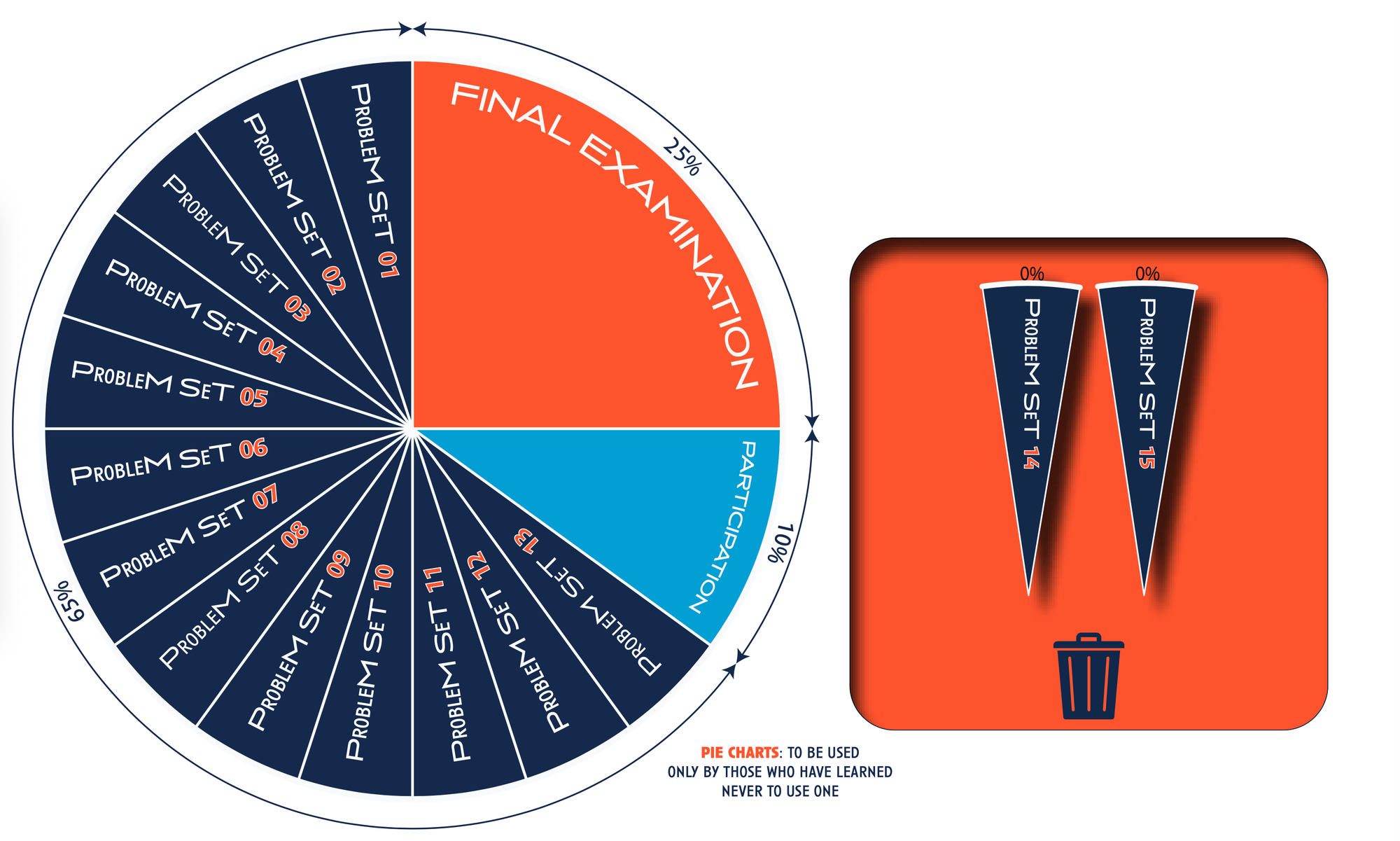 As the pie chart so clearly (?!) demonstrates, students would do well to focus on the weekly problem sets. There are fifteen in total, and they can drop two. All of the problem sets are graded on a pass/fail basis, so each one is basically 5% of the work it takes to get to 100% of the points. And they can even re-do problem sets they fail, so long as they earn the chance to do so (here's where formative assessment and gamification kick in!).