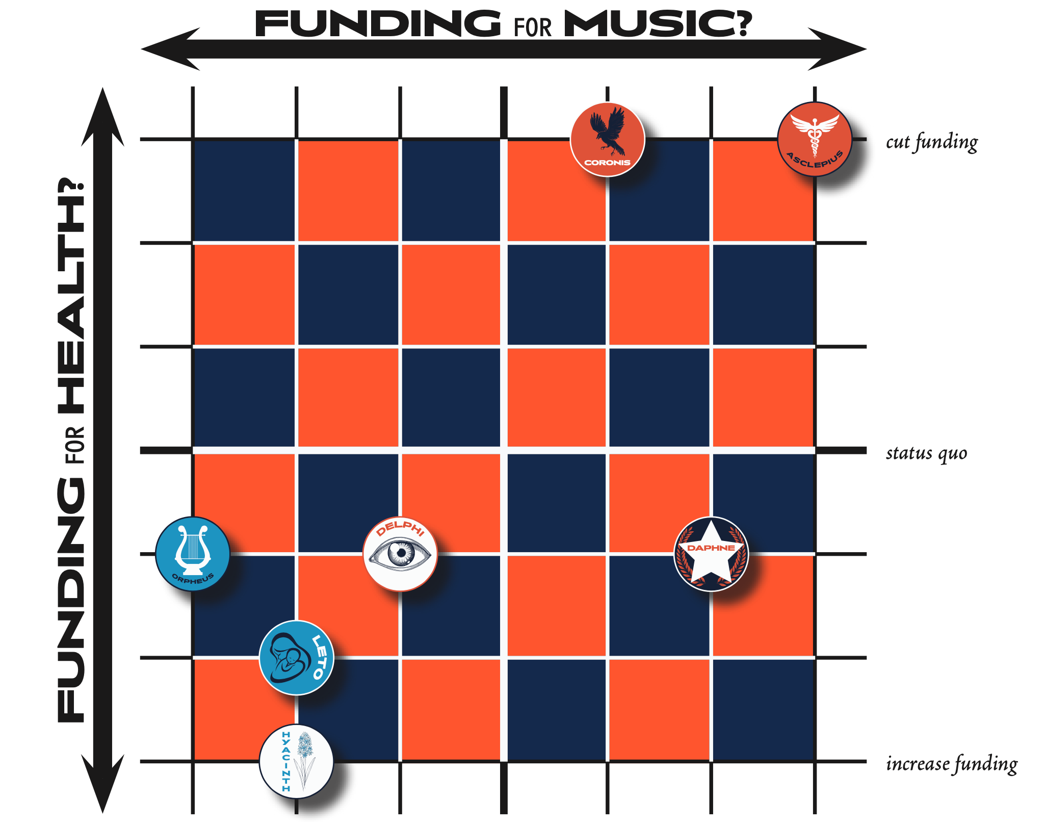 The Peacocks and Cows are trying to figure out how to navigate a two-dimensional policy space: one dimension is social policy, and the other is foreign policy.
